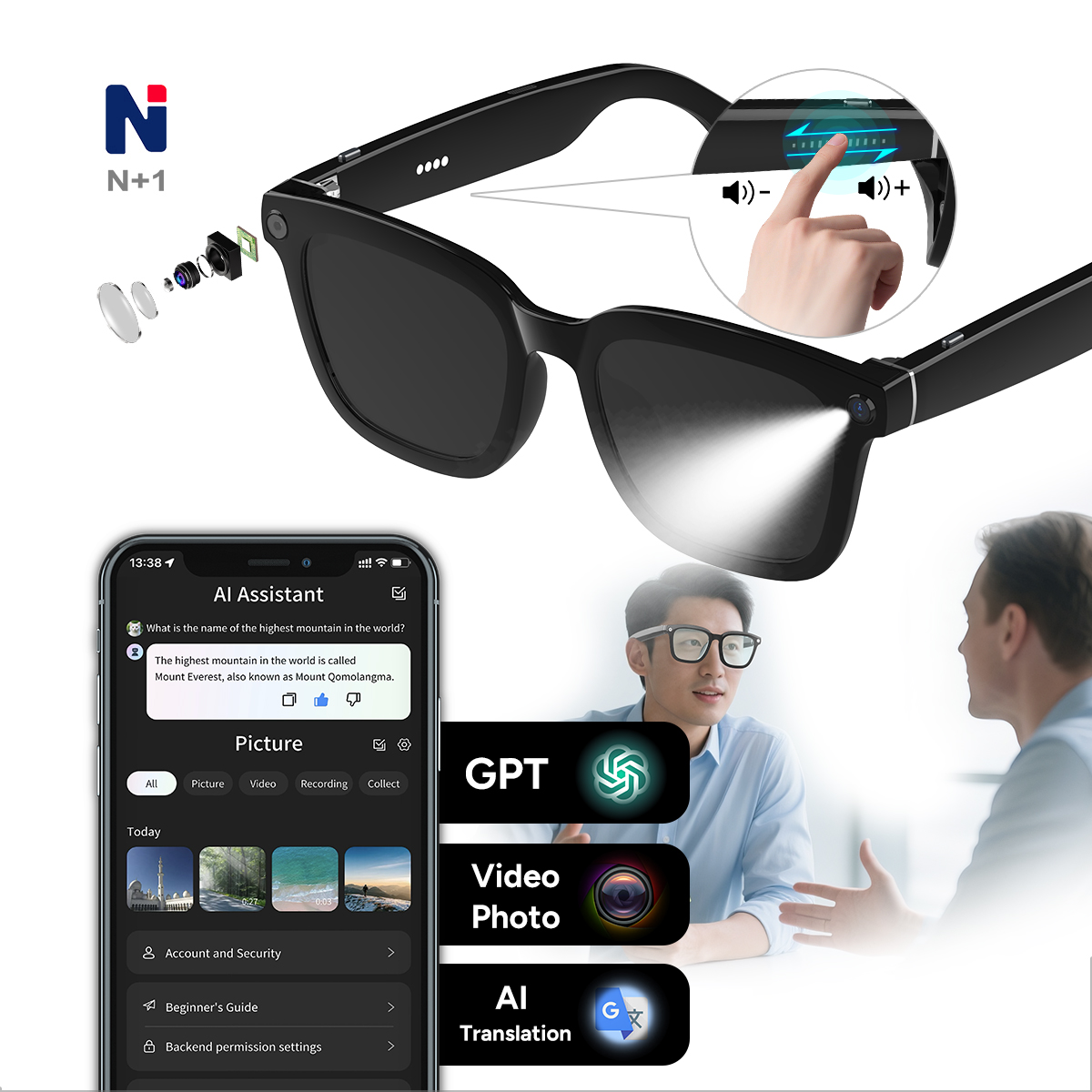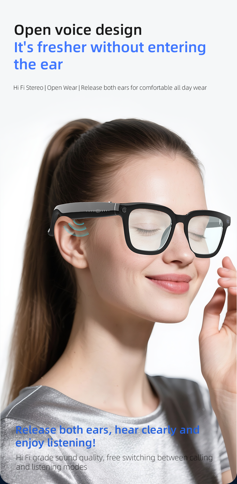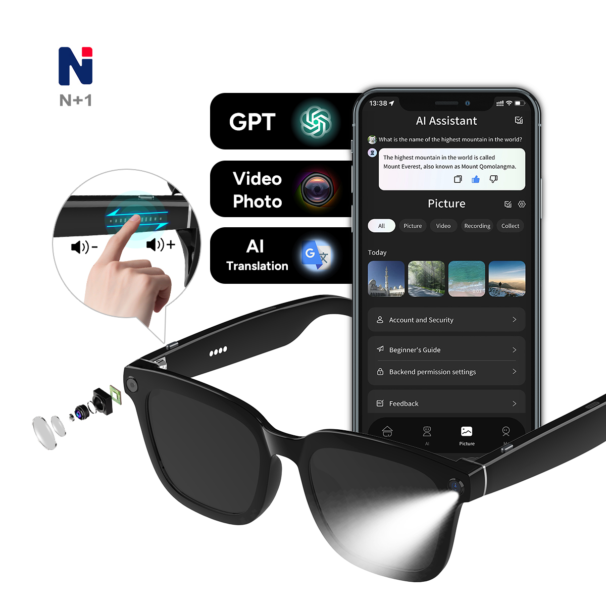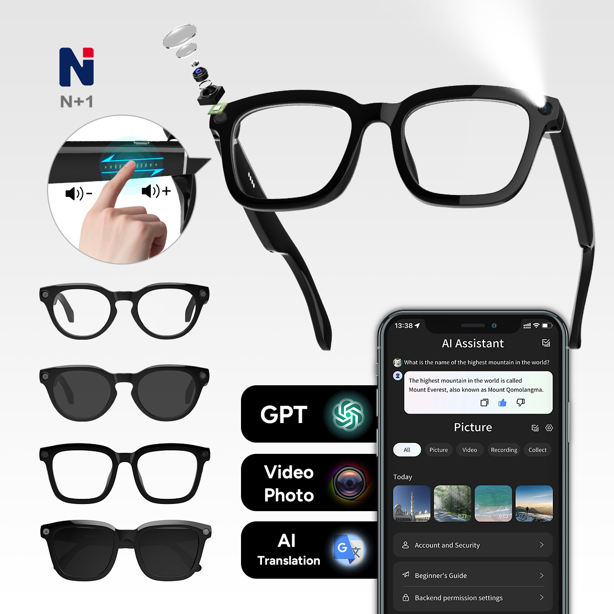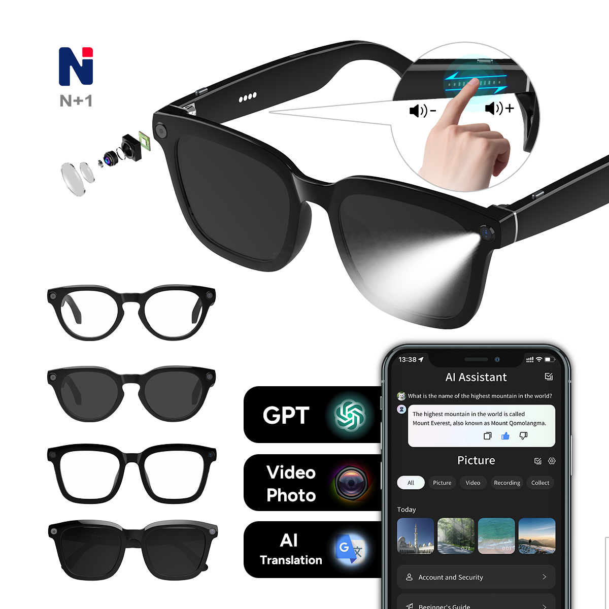 Product Features:AI conversation, AI voice assistant, AI object recognition, AI translation, AI optical image stabilization, wear detection, ENC dual silicon microphone noise reduction, video recording, photo taking, audio recording, music playback, local music, voice calls, notification sounds, app functions, built-in large model, left/right physical buttons, indicator light, right temple sliding touch area, OTA upgrade;