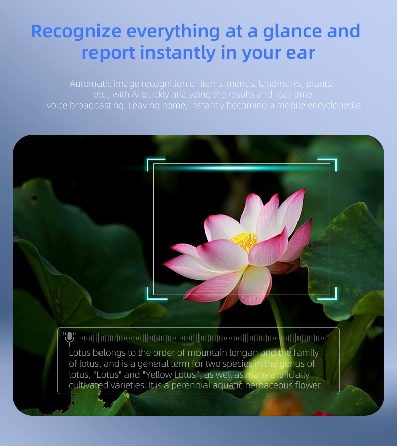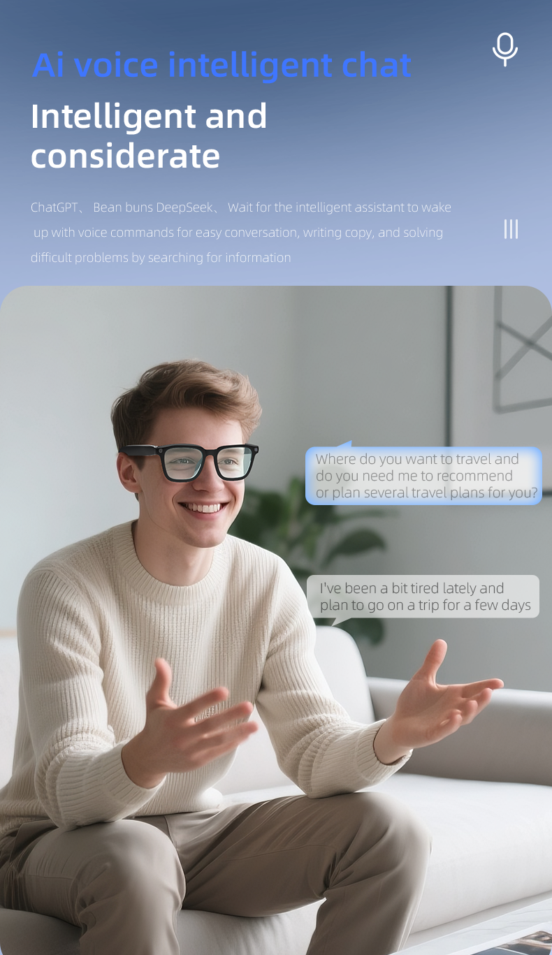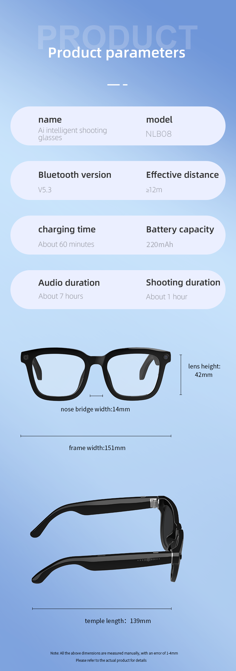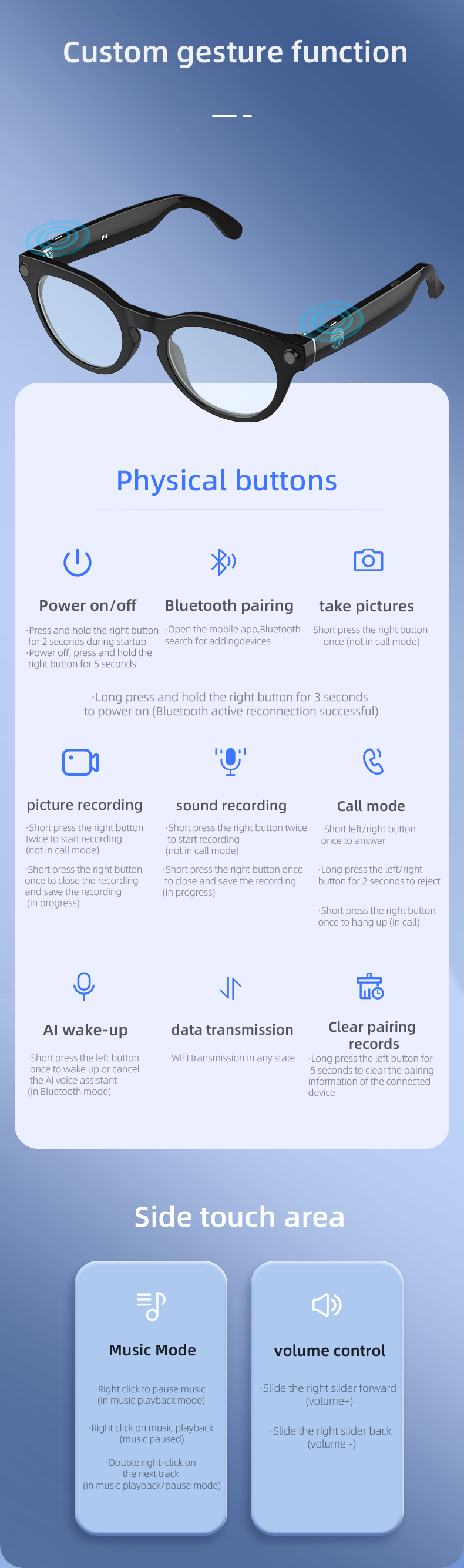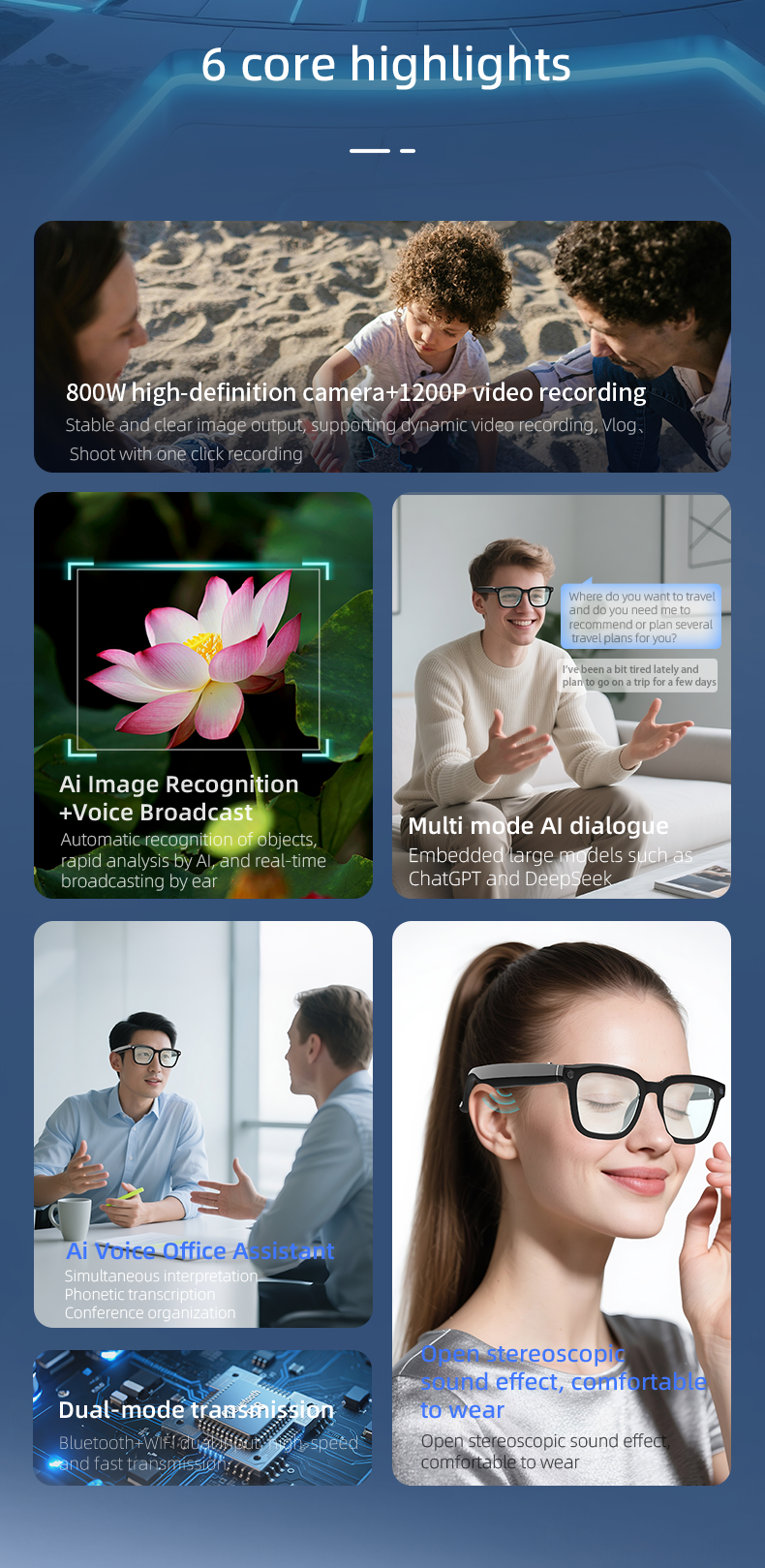 Product Features:AI conversation, AI voice assistant, AI object recognition, AI translation, AI optical image stabilization, wear detection, ENC dual silicon microphone noise reduction, video recording, photo taking, audio recording, music playback, local music, voice calls, notification sounds, app functions, built-in large model, left/right physical buttons, indicator light, right temple sliding touch area, OTA upgrade;