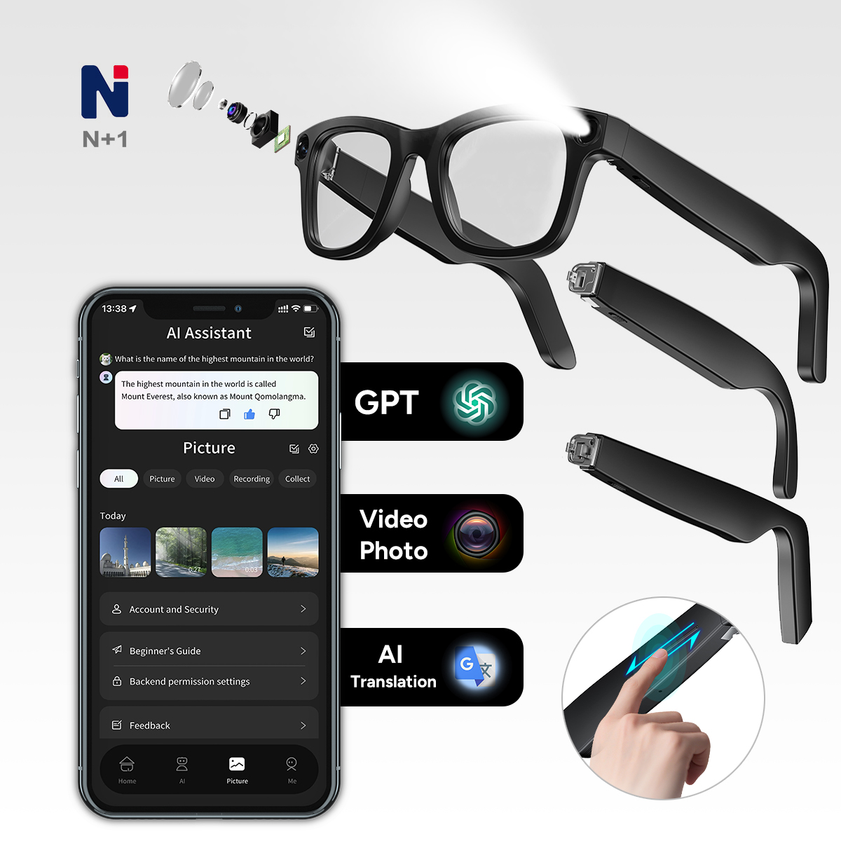 APP function:Video preview, video list, recording list, photo list, AI voice assistant, AI visual understanding, AI dialogue, photo recognition, memory check, language switching, OTA;