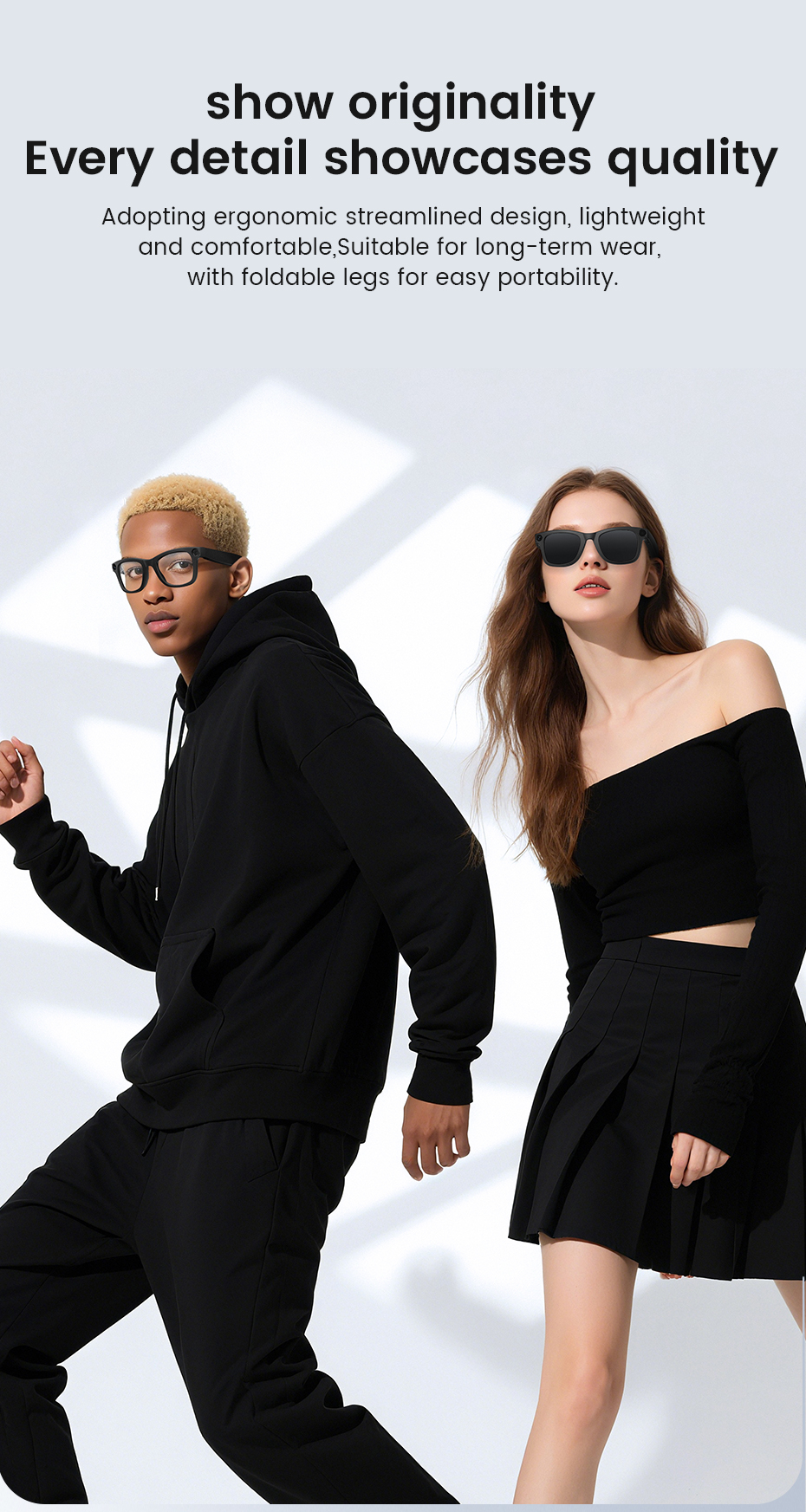 Product function:Bluetooth calls, photo taking, recording, video recording, volume adjustment, power on/off, music playback, switching between previous and next songs, AI translation, photo recognition, music playback, voice prompts, exercise, wearing detection, gesture sliding control;