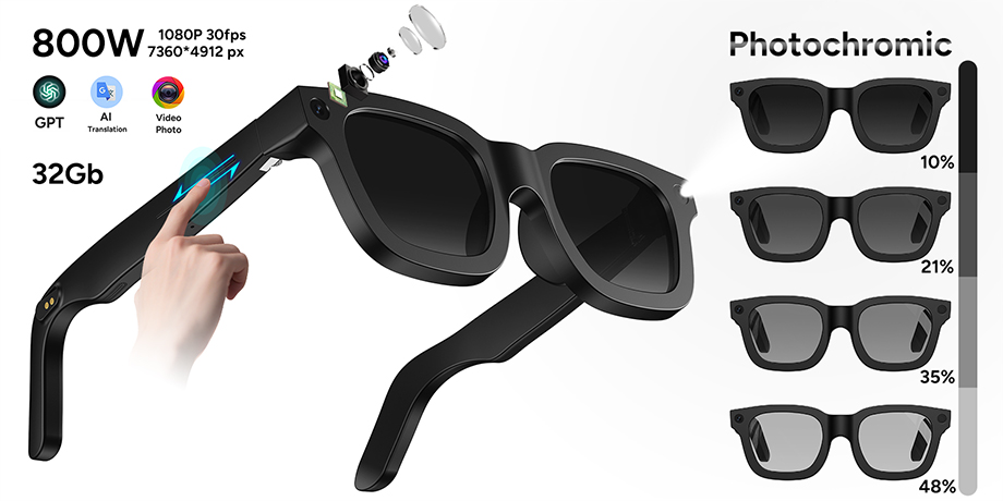 Product function:Bluetooth calls, photo taking, recording, video recording, volume adjustment, power on/off, music playback, switching between previous and next songs, AI translation, photo recognition, music playback, voice prompts, exercise, wearing detection, gesture sliding control;