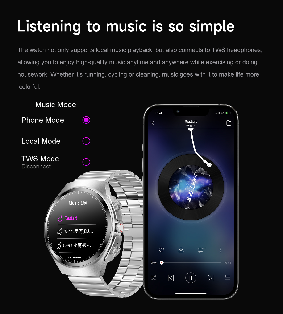 Music:Local MP3 music playback, support for connecting TWS earphones to the watch, mobile music playback, music control;