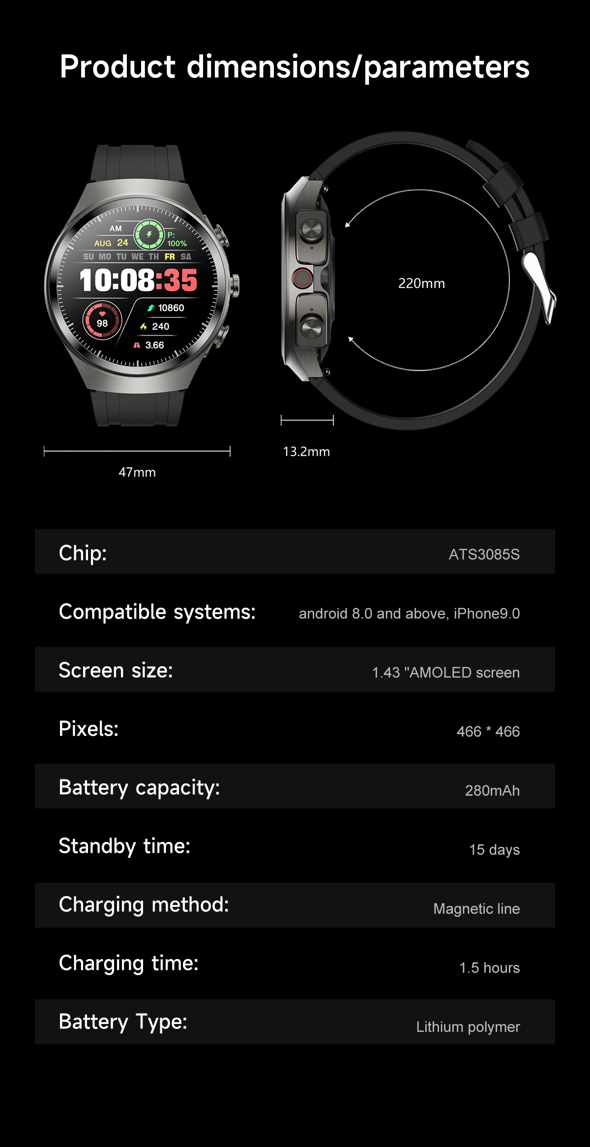 Screen:1.43" 466*466 AMOLED full touchscreen;