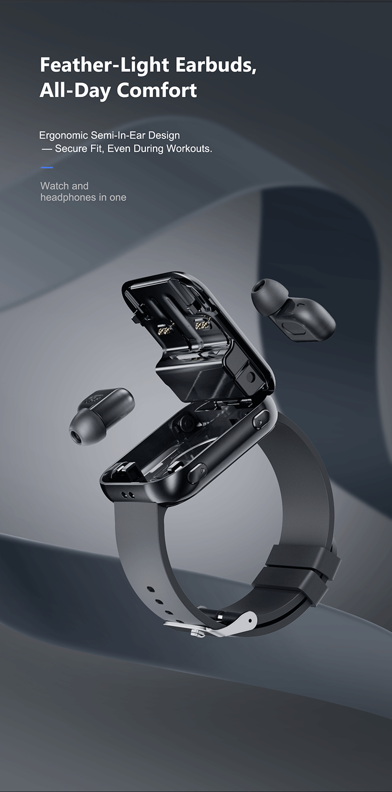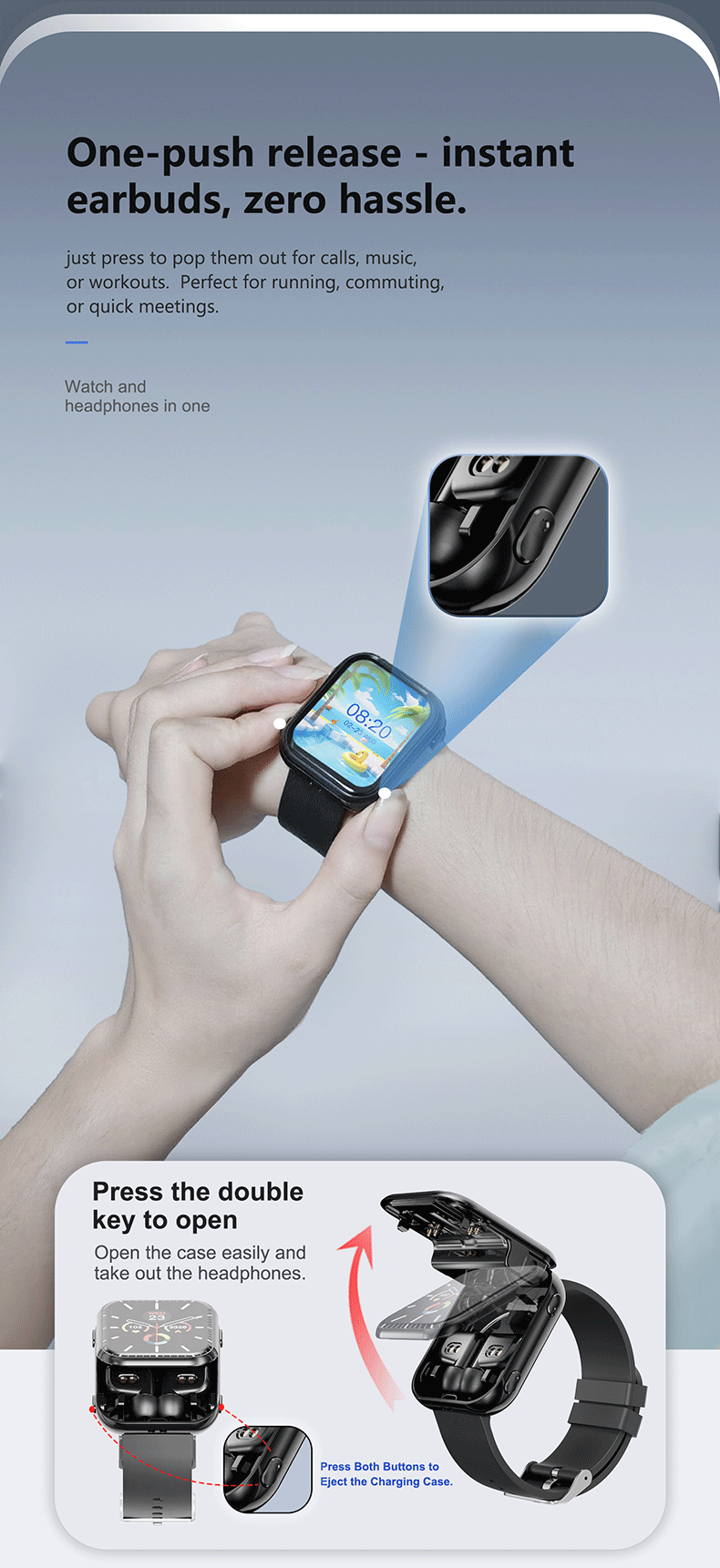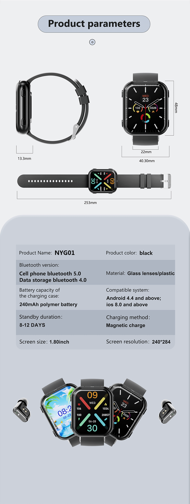 Watch battery:240mAh polymer battery (Magnetic charge, Charging time 1-2 hours, Can charge the earphones 2-3 times, Life time 8-12 days,);