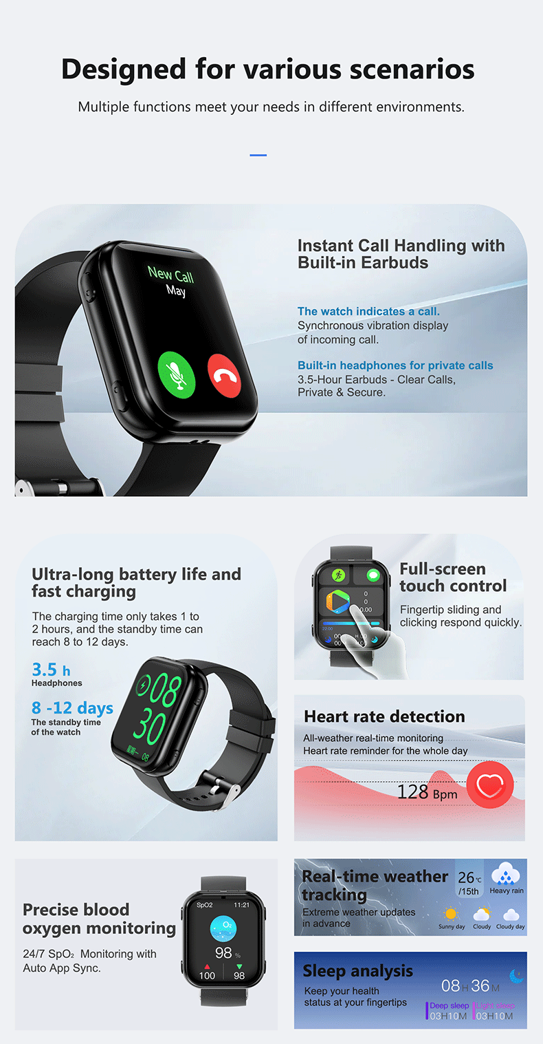 Our products are rich in styles, such as smart watches, Bluetooth call watches, SIM card call watches, Women's exclusive smart bracelets, outdoor climbing watches, etc., all of them support OEM/ODM orders ;